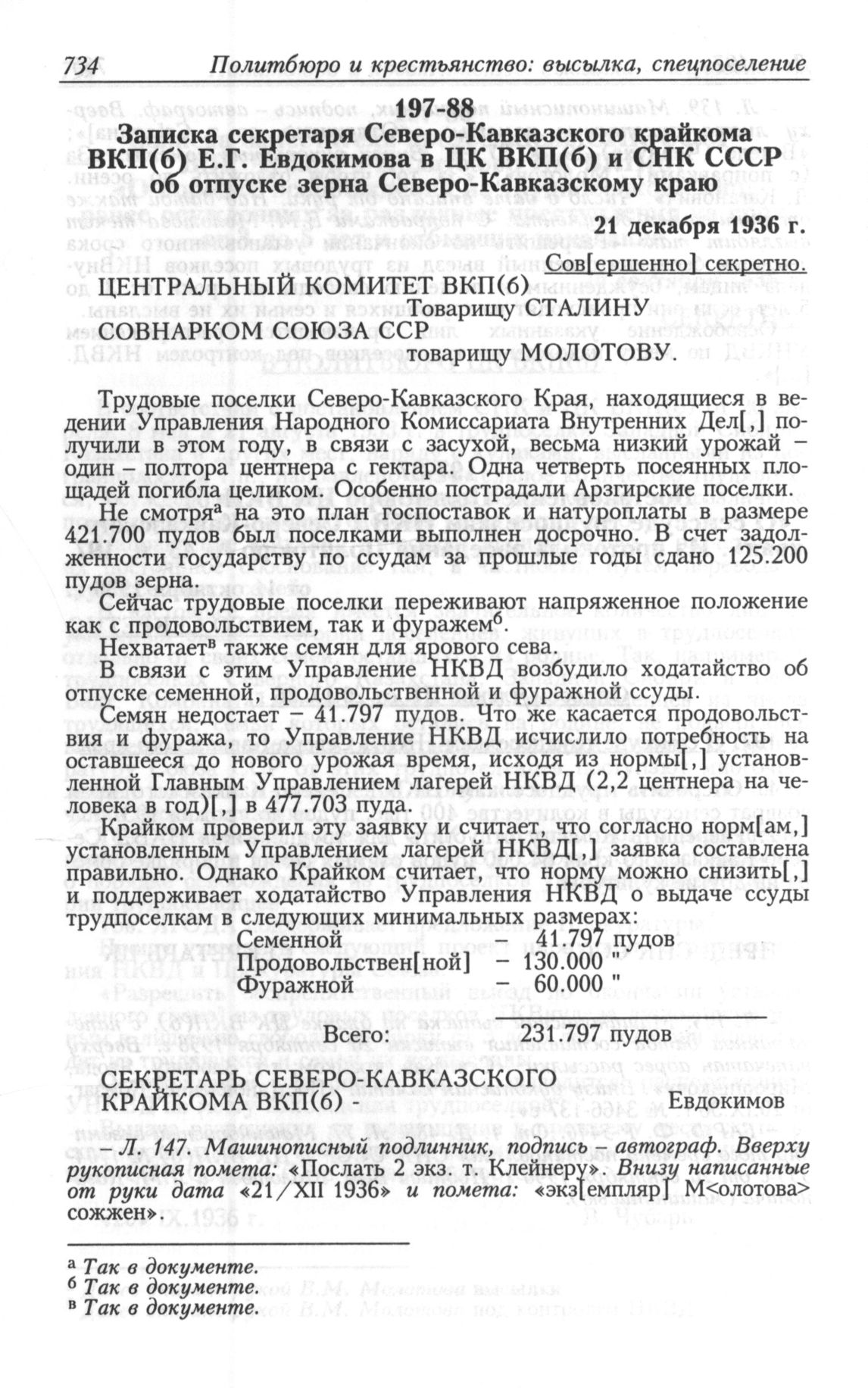 Записка секретаря Северо-Кавказского крайкома ВКП(б) Е.Г. Евдокимова в ЦК ВКП(б) и СНК СССР об отпуске зерна Северо-Кавказскому краю. 21 декабря 1936 г. // АП РФ. Ф. 3. Оп. 30. Д. 197. Л. 147. Машинописный подлинник, подпись-автограф.