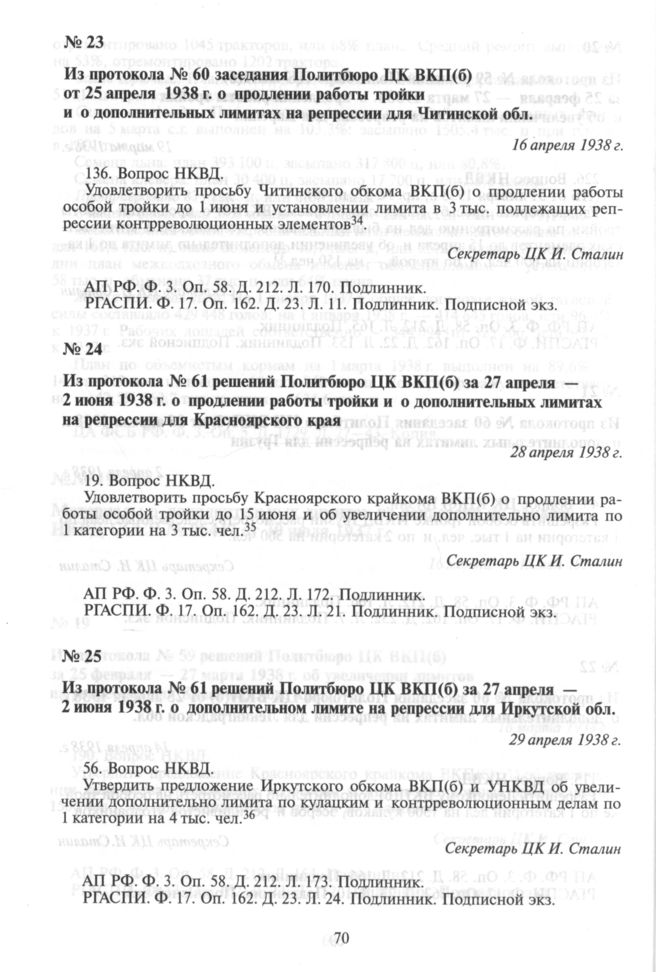 Из протокола № 61 решений Политбюро ЦК ВКП(б) за 27 апреля — 2 июня 1938 г. о продлении работы тройки и о дополнительных лимитах на репрессии для Красноярского края. 28 апреля 1938 г. // АП РФ. Ф. 3. Оп. 58. Д. 212. Л. 172. Подлинник. РГАСПИ. Ф. 17. Оп. 162. Д. 23. Л. 21. Подлинник. Подписной экз.