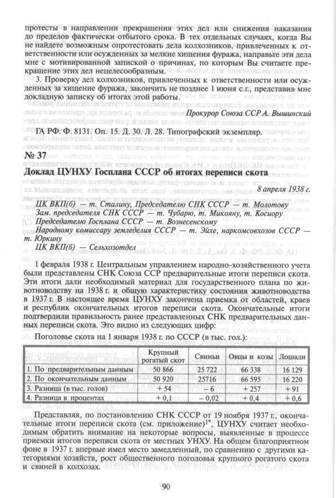 Доклад ЦУНХУ Госплана СССР об итогах переписи скота. 8 апреля 1938 г. // РГАЭ. Ф. 1562. Оп. 1. Д. 1051. Л. 135—121. Заверенная копия.