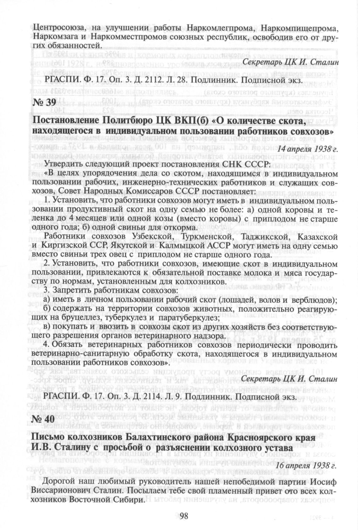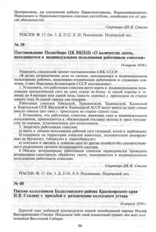 Постановление Политбюро ЦК ВКП(б) «О количестве скота, находящегося в индивидуальном пользовании работников совхозов». 14 апреля 1938 г. // РГАСПИ. Ф. 17. Оп. 3. Д. 2114. Л. 9. Подлинник. Подписной экз.