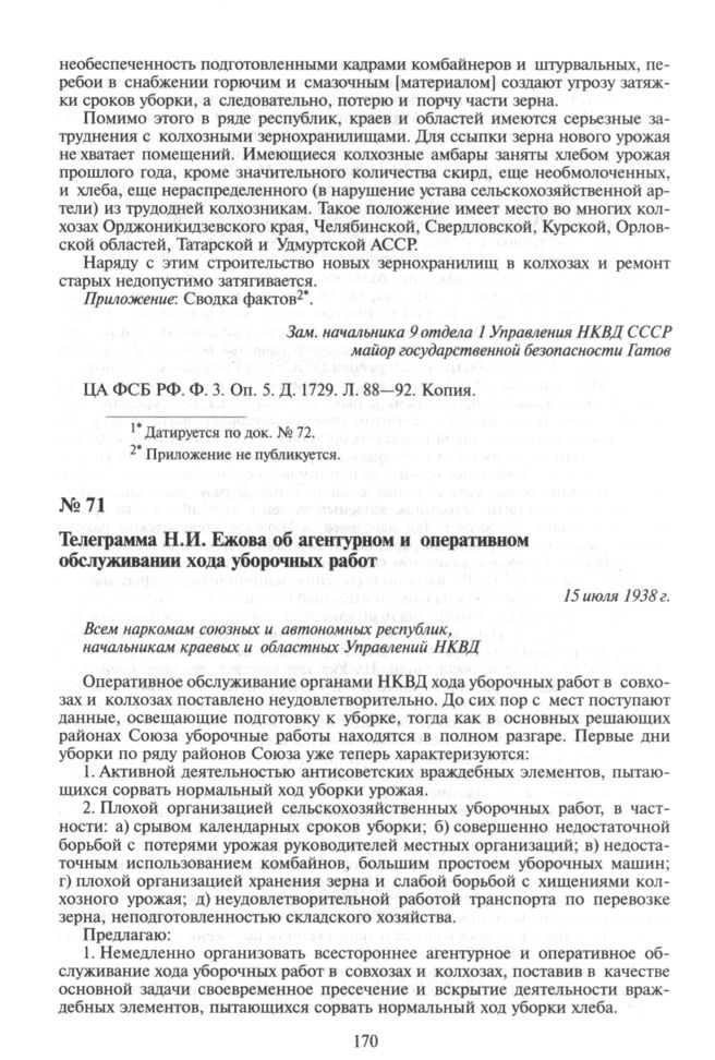Телеграмма Н.И. Ежова об агентурном и оперативном обслуживании хода уборочных работ. 15 июля 1938 г. // ЦА ФСБ РФ. Ф. 3. Оп. 5. Д. 87. Л. 453—455. Копия.
