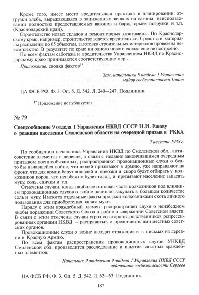 Спецсообщение 9 отдела 1 Управления НКВД СССР Н.И. Ежову о реакции населения Смоленской области на очередной призыв в РККА. 7 августа 1938 г. // ЦА ФСБ РФ. Ф. 3. Оп. 5. Д. 542. Л. 62—63. Подлинник.