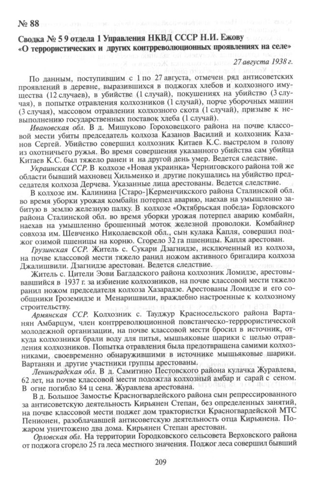 Сводка № 5 9 отдела 1 Управления НКВД СССР Н.И. Ежову «О террористических и других контрреволюционных проявлениях на селе». 21 августа 1938 г. // ЦА ФСБ РФ. Ф. 3. Оп. 5. Д. 1732. Л. 49-53. Копия.