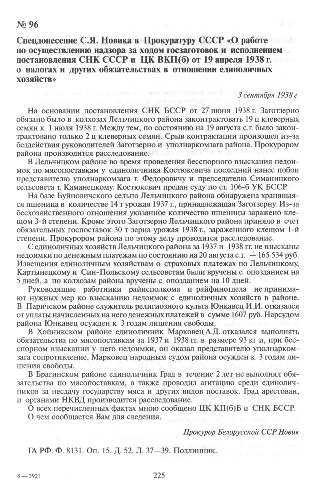 Спецдонесение С.Я. Новика в Прокуратуру СССР «О работе по осуществлению надзора за ходом госзаготовок и исполнением постановления СНК СССР и ЦК ВКП(б) от 19 апреля 1938 г. о налогах и других обязательствах в отношении единоличных хозяйств». 3 сентября 1938 г. // ГА РФ. Ф. 8131. Оп. 15. Д. 52. Л. 37—39. Подлинник.