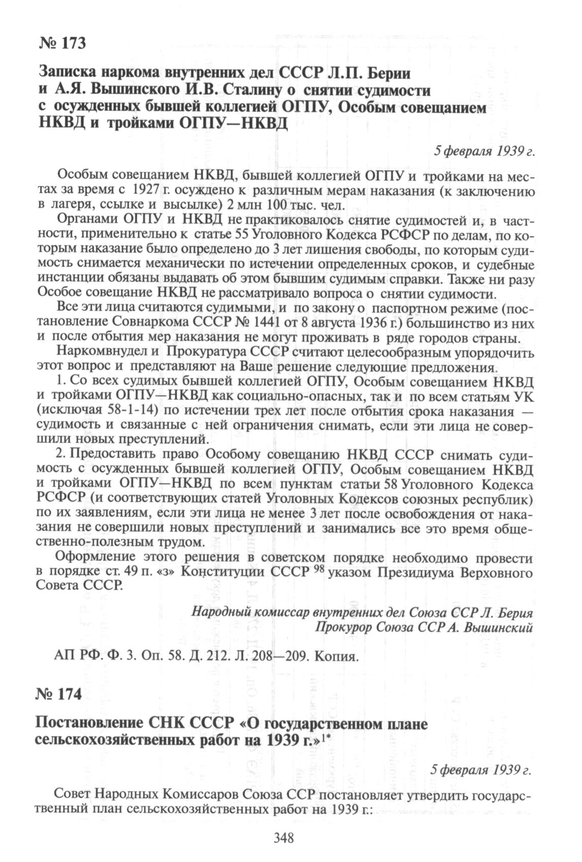 Записка наркома внутренних дел СССР Л.П. Берии и А.Я. Вышинского И.В. Сталину о снятии судимости с осужденных бывшей коллегией ОГПУ, Особым совещанием НКВД и тройками ОГПУ—НКВД. 5 февраля 1939 г. // АП РФ. Ф. 3. Оп. 58. Д. 212. Л. 208-209. Копия.