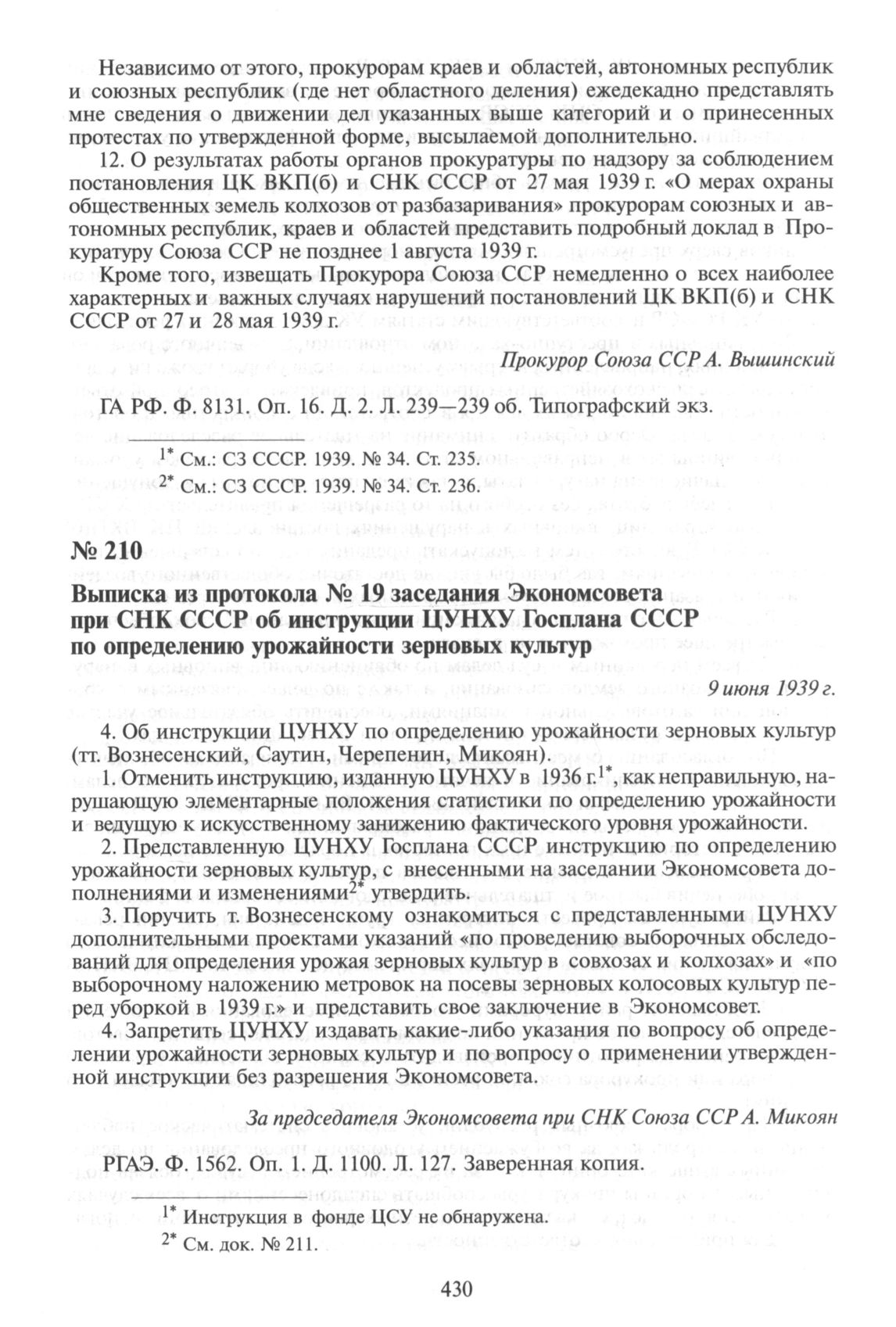 Выписка из протокола № 19 заседания Экономсовета при СНК СССР об инструкции ЦУНХУ Госплана СССР по определению урожайности зерновых культур. 9 июня 1939 г. // РГАЭ. Ф. 1562. Оп. 1. Д. 1100. Л. 127. Заверенная копия.