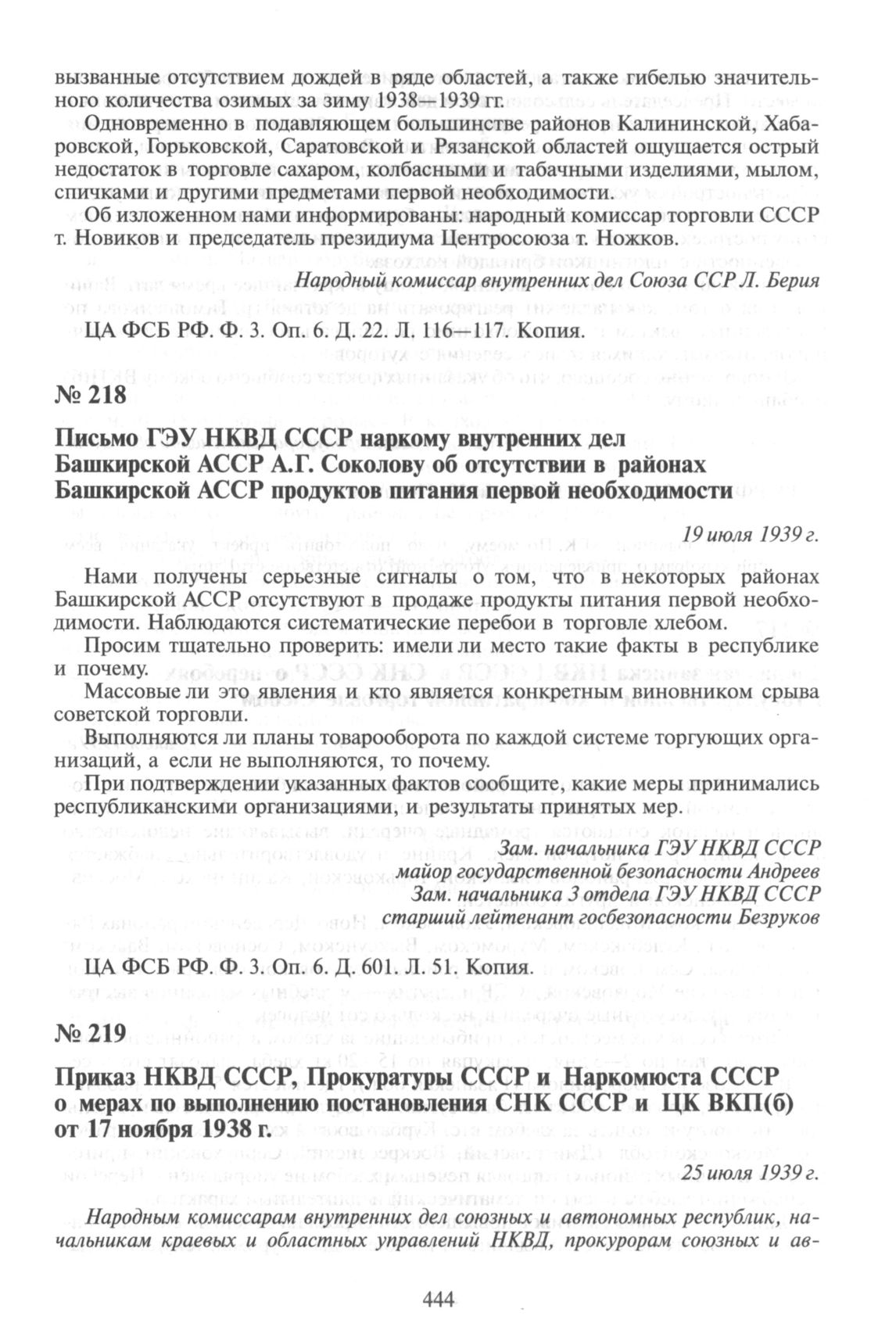 Приказ НКВД СССР, Прокуратуры СССР и Наркомюста СССР о мерах по выполнению постановления СНК СССР и ЦК ВКП(б) от 17 ноября 1938 г. 25 июля 1939 г. // ЦА ФСБ. РФ. Ф. 66. Оп. 1. Д. 5716. Л. 159—160. Подлинник.