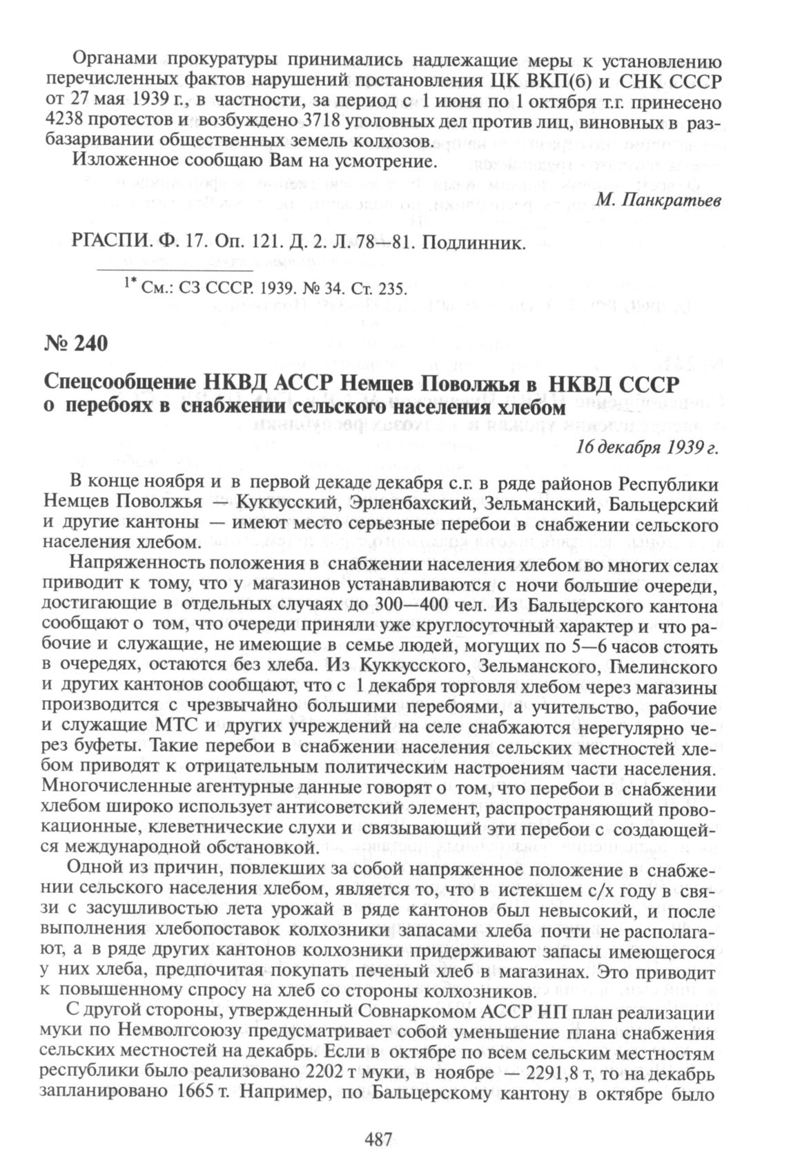 Спецсообщение НКВД АССР Немцев Поволжья в НКВД СССР о перебоях в снабжении сельского населения хлебом. 16 декабря 1939 г. // ЦА ФСБ РФ. Ф. 3. Оп. 6. Д. 601. Л. 397—399. Подлинник.