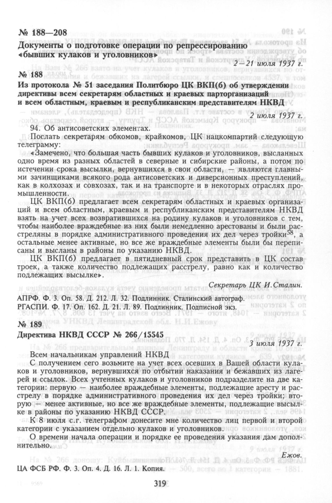 Документы о подготовке операции по репрессированию «бывших кулаков и уголовников». Директива НКВД СССР № 266/15545. 3 июля 1937 г.