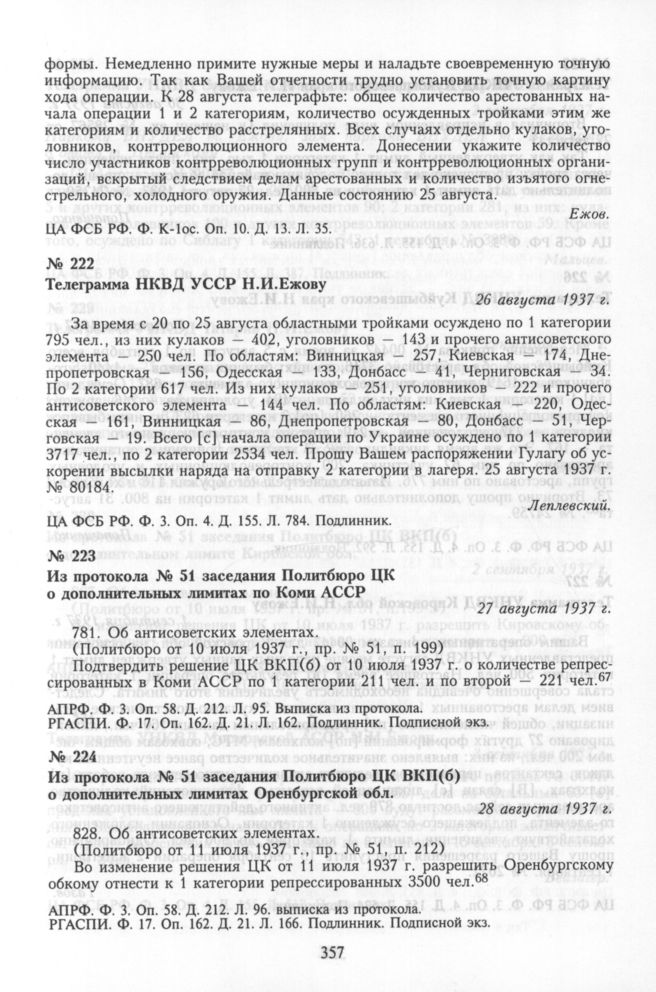 Из протокола № 51 заседания Политбюро ЦК о дополнительных лимитах по Коми АССР. 27 августа 1937 г. // АПРФ. Ф. 3. Оп. 58. Д. 212. Л. 95. Выписка из протокола. РГАСПИ. Ф. 17. Оп. 162. Д. 21. Л. 162. Подлинник. Подписной экз.