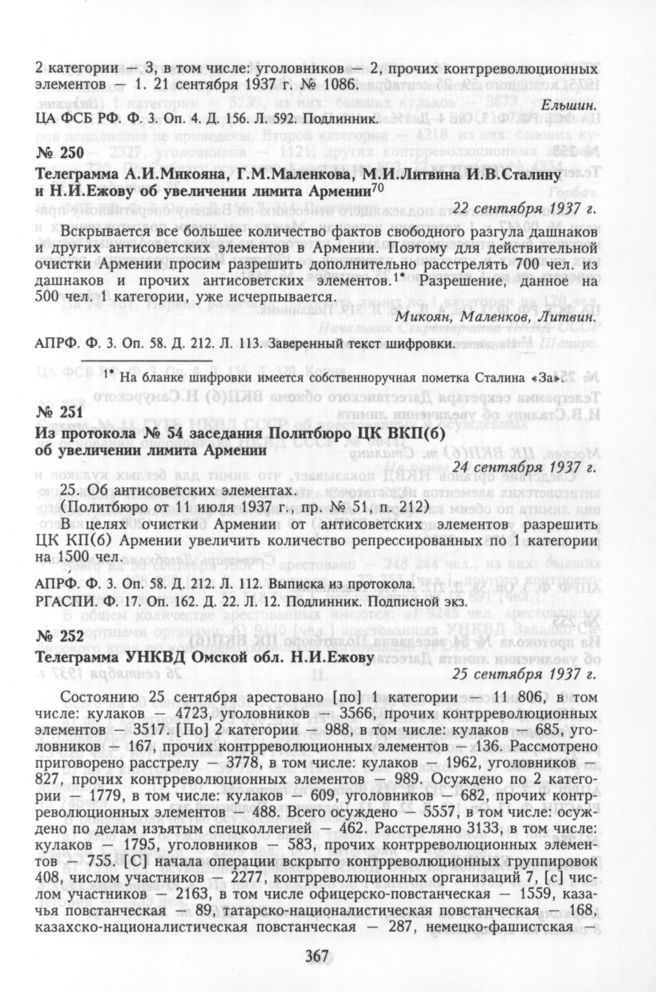 Из протокола № 54 заседания Политбюро ЦК ВКП(б) об увеличении лимита Армении. 24 сентября 1937 г. // АПРФ. Ф. 3. Оп. 58. Д. 212. Л. 112. Выписка из протокола. РГАСПИ. Ф. 17. Оп. 162. Д. 22. Л. 12. Подлинник. Подписной экз.