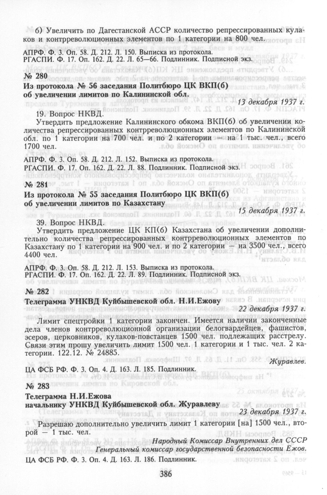 Из протокола № 56 заседания Политбюро ЦК ВКП(б) об увеличении лимитов по Калининской обл. 13 декабря 1937 г. // АПРФ. Ф. 3. Оп. 58. Д. 212. Л. 152. Выписка из протокола. РГАСПИ. Ф. 17. Оп. 162. Д. 22. Л. 88. Подлинник. Подписной экз.