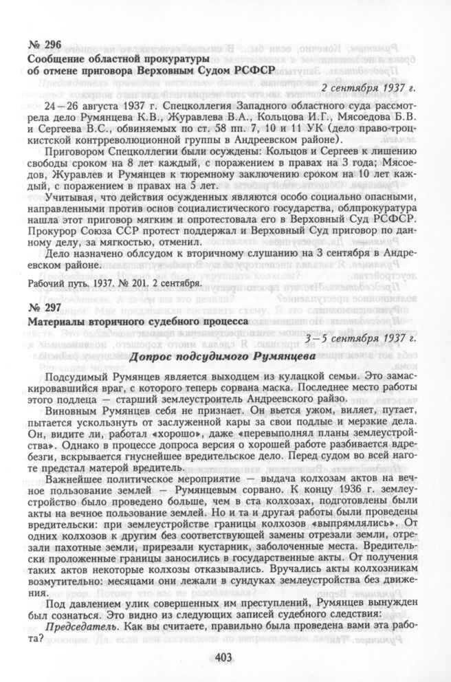 Показательный судебный процесс в Андреевском районе Смоленщины. Сообщение областной прокуратуры об отмене приговора Верховным Судом РСФСР. 2 сентября 1937 г. // Рабочий путь. 1937. № 201. 2 сентября.
