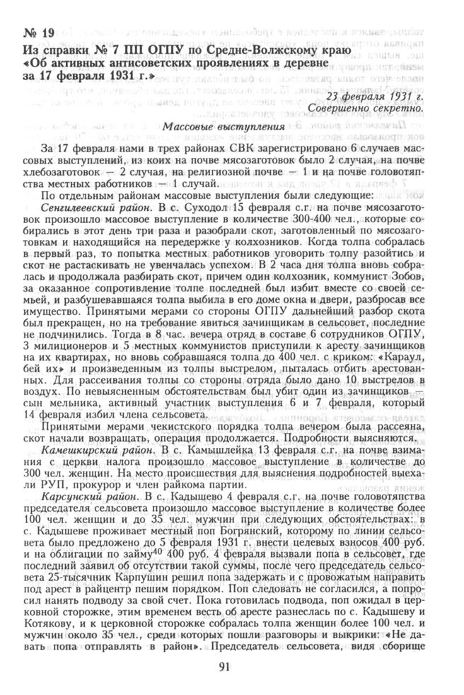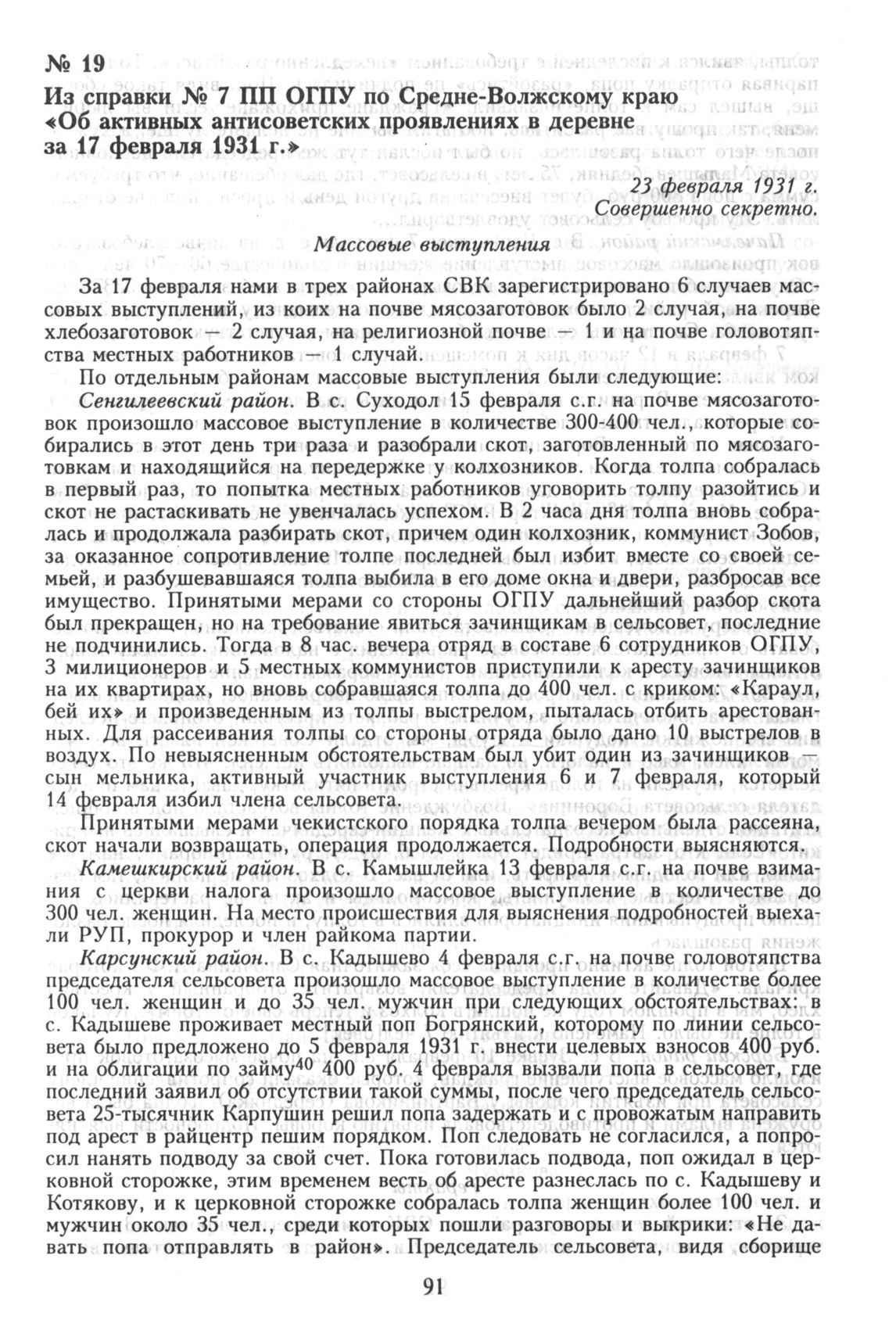 Из справки № 7 ПП ОГПУ по Средне-Волжскому краю «Об активных антисоветских проявлениях в деревне за 17 февраля 1931 г.». 23 февраля 1931 г.