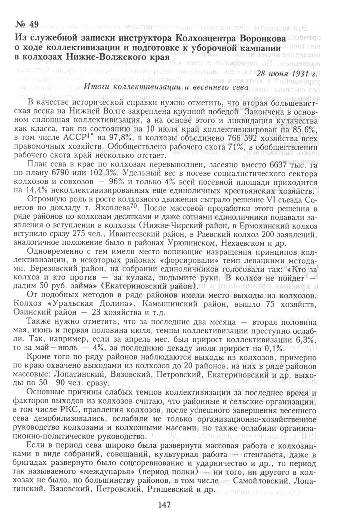 Из служебной записки инструктора Колхозцентра Воронкова о ходе коллективизации и подготовке к уборочной кампании в колхозах Нижне-Волжского края. 28 июня 1931 г. // РГАЭ. Ф. 7446. Оп. 2. Д. 479. Л. 149-153. Копия.