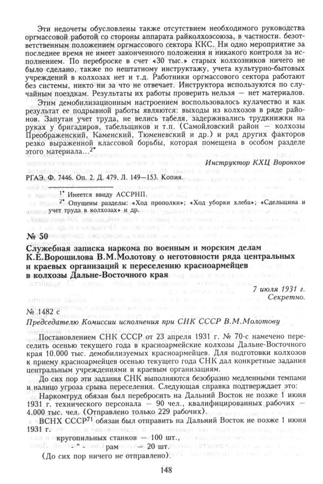 Служебная записка наркома по военным и морским делам К.Е. Ворошилова В.М. Молотову о неготовности ряда центральных и краевых организаций к переселению красноармейцев в колхозы Дальне-Восточного края. 7 июля 1931 г. // РГВА. Ф. 33987. Оп. 3. Д. 369. Л. 205-205 об. Копия.