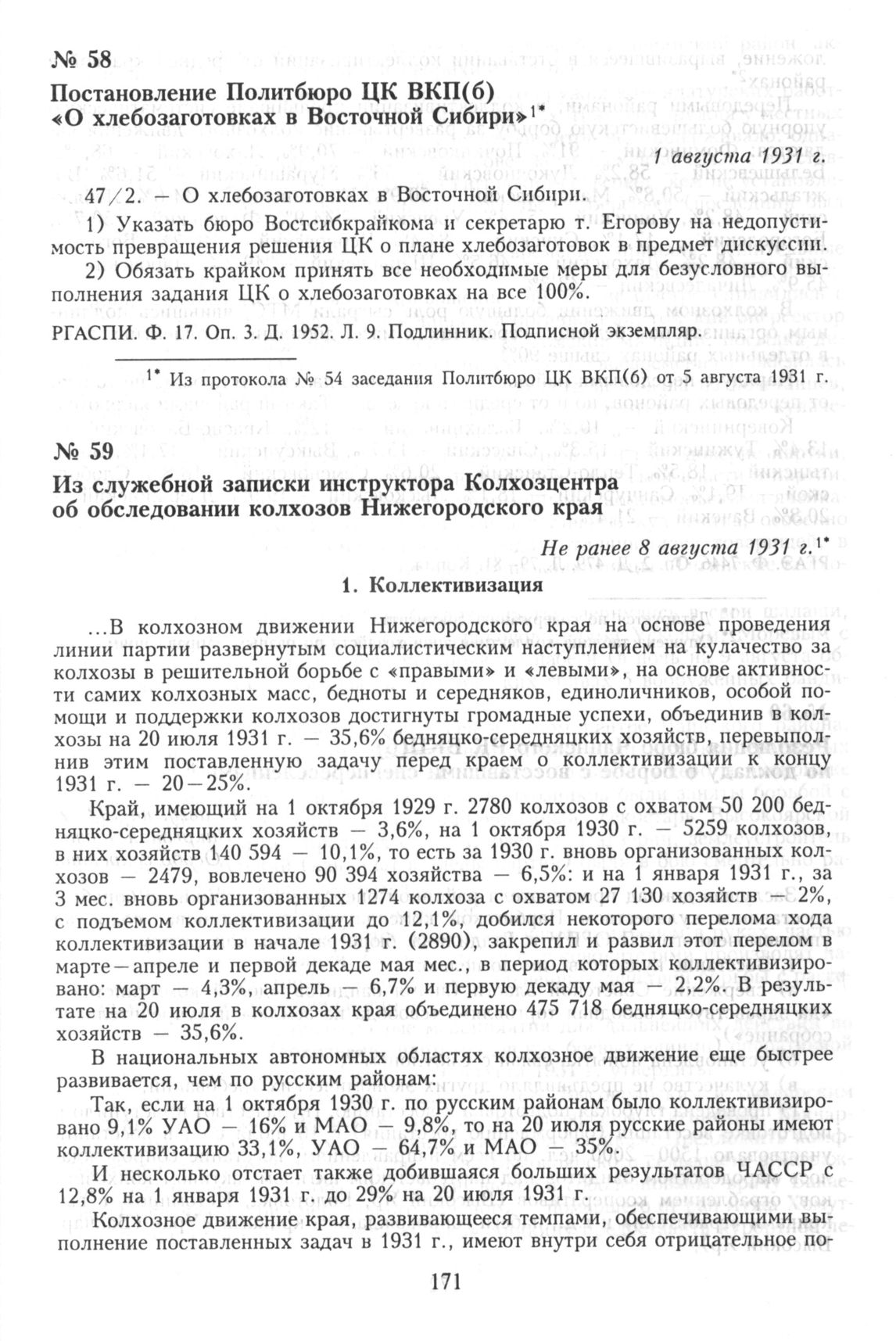 Постановление Политбюро ЦК ВКП(б) «О хлебозаготовках в Восточной Сибири». 1 августа 1931 г.