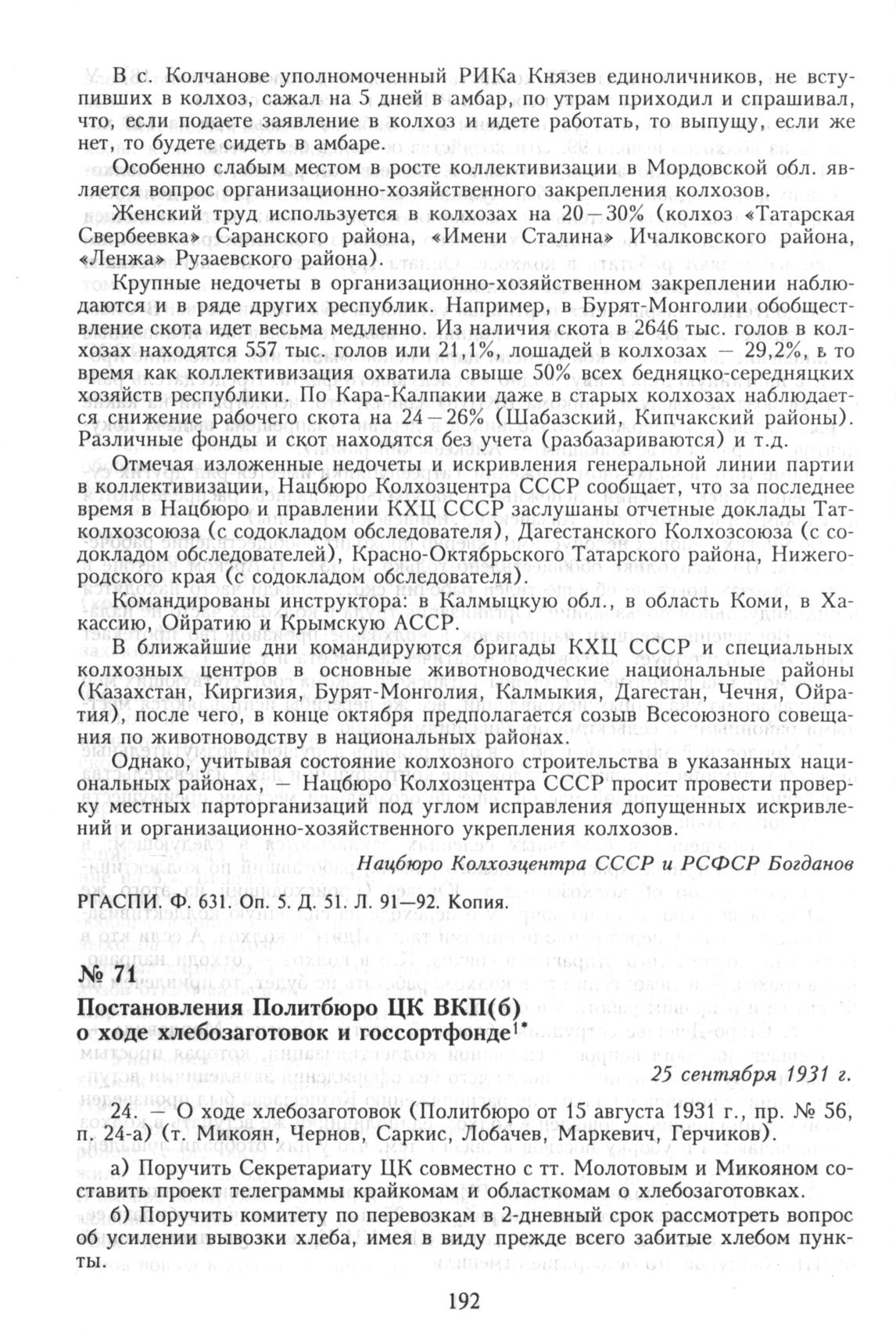 Постановления Политбюро ЦК ВКП(б) о ходе хлебозаготовок и госсортфонде. 25 сентября 1931 г.
