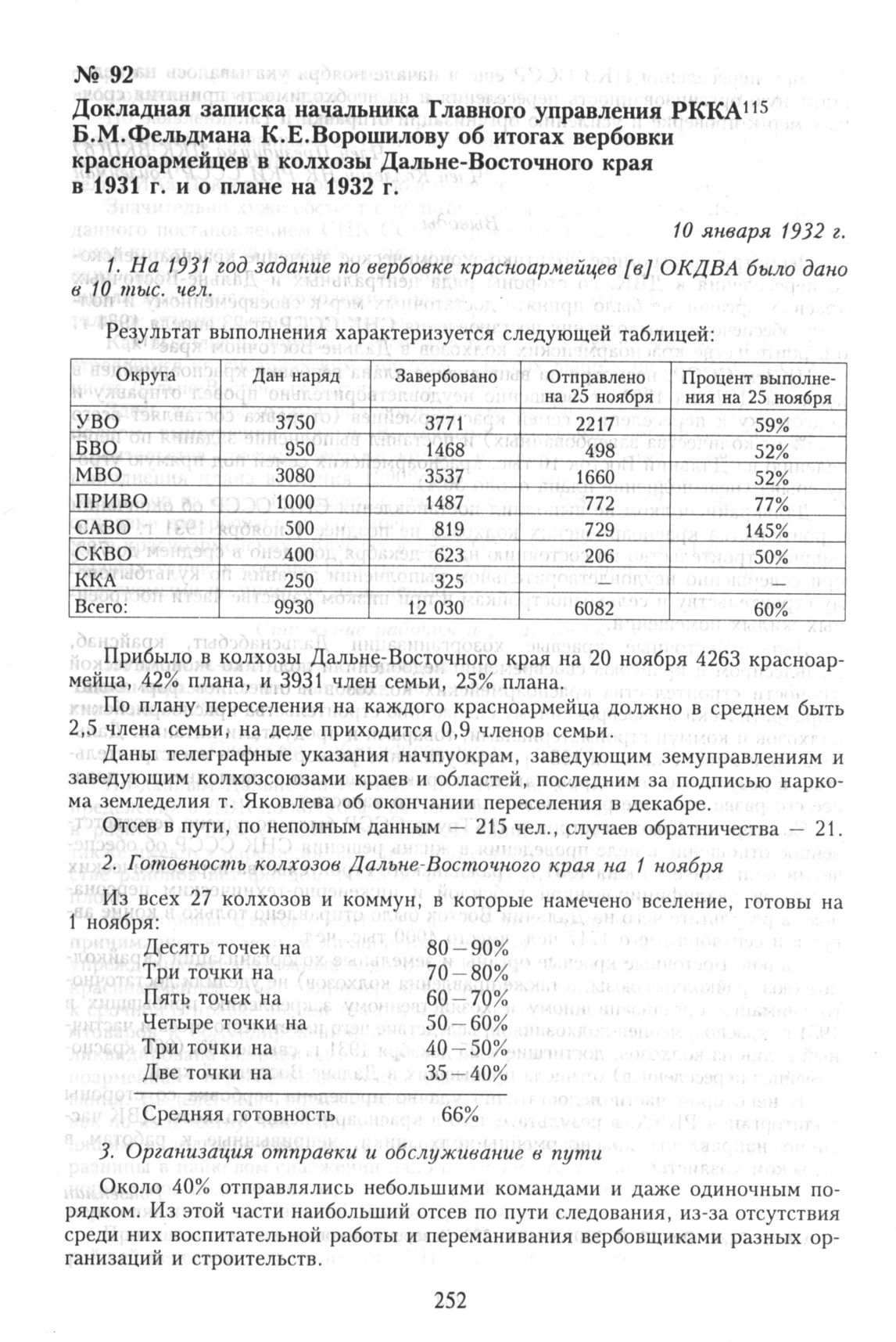 Докладная записка начальника Главного управления РККА Б.М. Фельдмана К.Е. Ворошилову об итогах вербовки красноармейцев в колхозы Дальне-Восточного края в 1931 г. и о плане на 1932 г. 10 января 1932 г. // РГВА. Ф. 33987. Оп. 3. Д. 362. Л. 120—122. Подлинник.