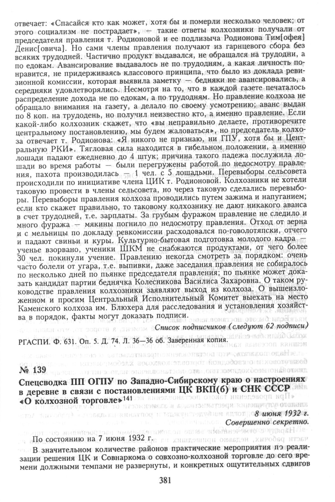 Спецсводка ПП ОГПУ по Западно-Сибирскому краю о настроениях в деревне в связи с постановлениями ЦК ВКП(б) и СНК СССР «О колхозной торговле». 8 июня 1932 г. // ЦА ФСБ РФ. Ф. 2. Оп. 10. Д. 521. Л. 442—446. Заверенная копия.