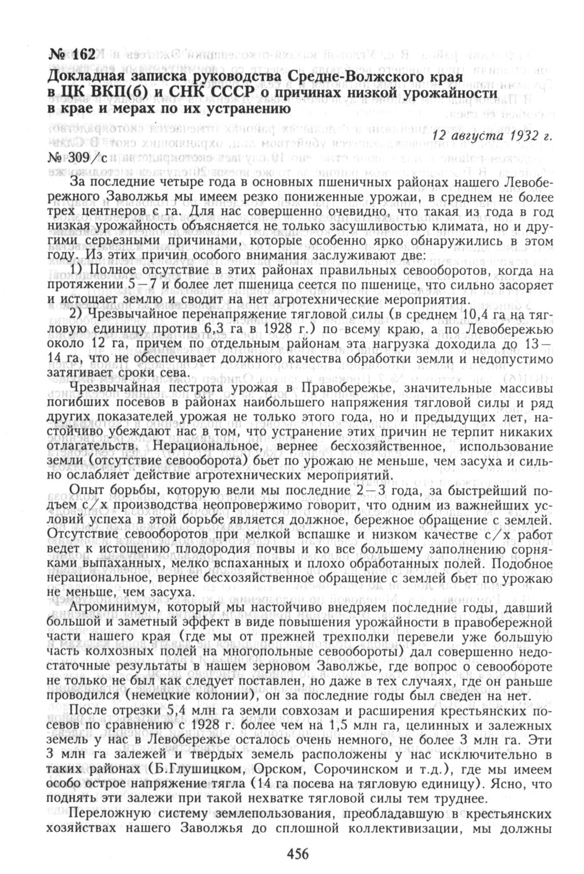 Докладная записка руководства Средне-Волжского края в ЦК ВКП(б) и СНК СССР о причинах низкой урожайности в крае и мерах по их устранению. 12 августа 1932 г.