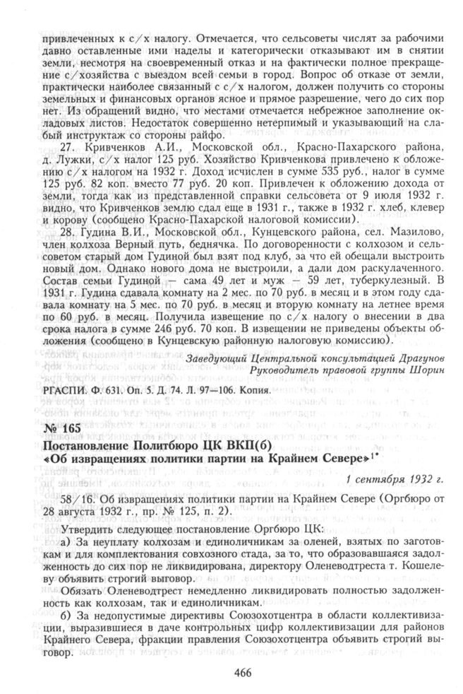 Постановление Политбюро ЦК ВКП(б) «Об извращениях политики партии на Крайнем Севере». 1 сентября 1932 г. // РГАСПИ. Ф. 17. Оп. 3. Д. 2012. Л. 12, 16—18. Подлинник. Подписной экземпляр.
