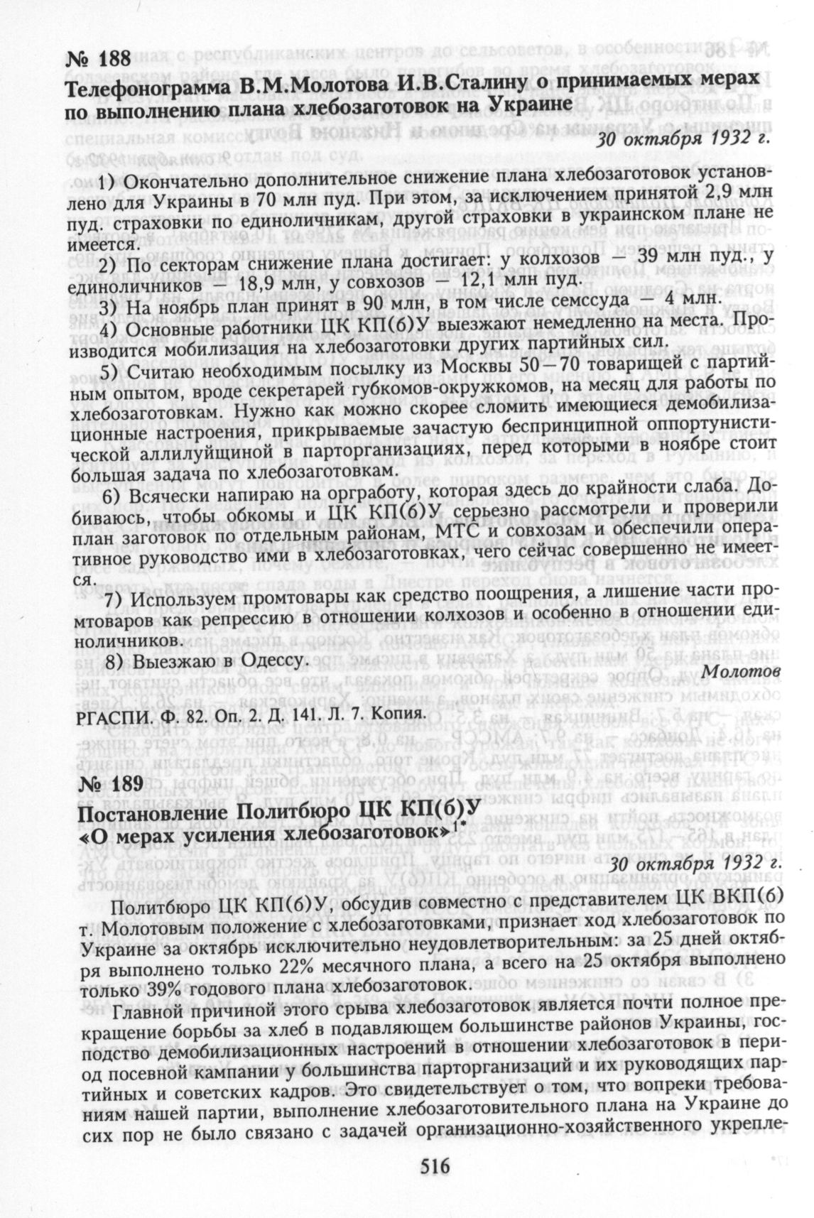 Телефонограмма В.М. Молотова И.В. Сталину о принимаемых мерах по выполнению плана хлебозаготовок на Украине. 30 октября 1932 г. // РГАСПИ. Ф. 82. Оп. 2. Д. 141. Л. 7. Копия.
