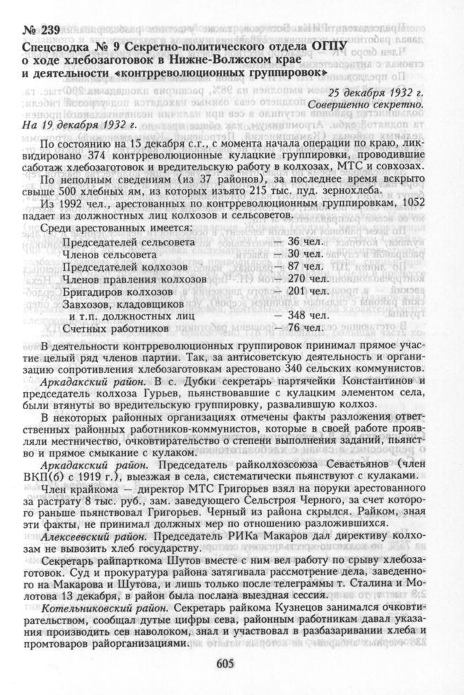 Спецсводка № 9 Секретно-политического отдела ОГПУ о ходе хлебозаготовок в Нижне-Волжском крае и деятельности «контрреволюционных группировок». 25 декабря 1932 г.