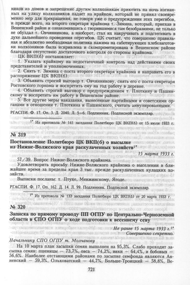 Постановление Политбюро ЦК ВКП(б) о высылке из Нижне-Волжского края раскулаченных хозяйств. 15 марта 1933 г.