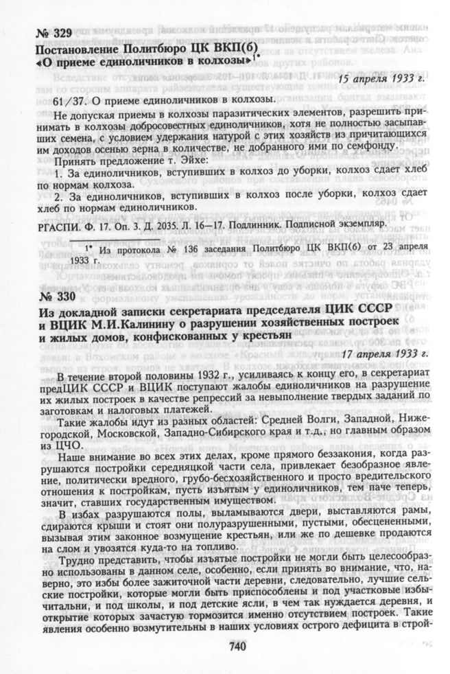 Постановление Политбюро ЦК ВКП(б) «О приеме единоличников в колхозы». 15 апреля 1933 г.