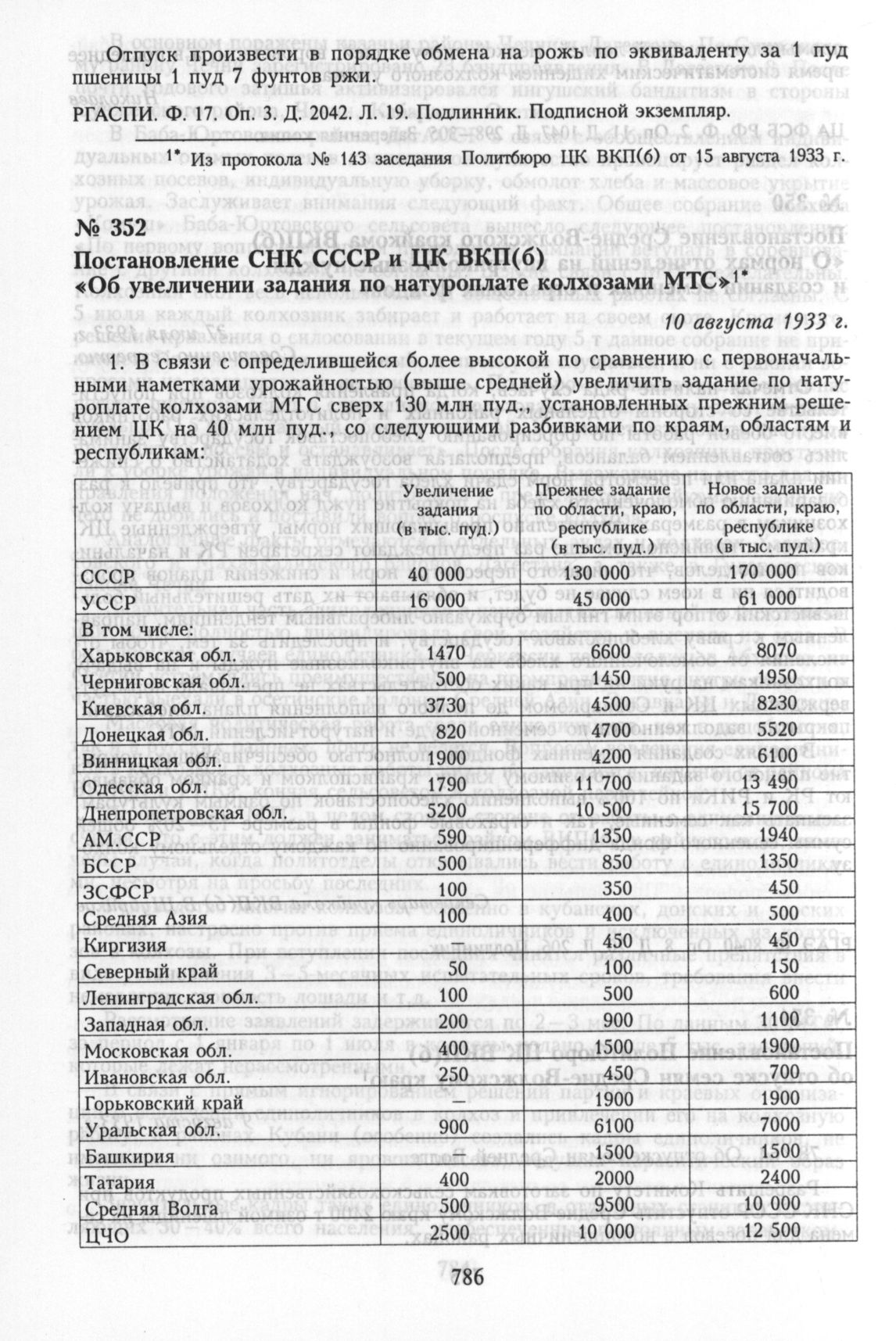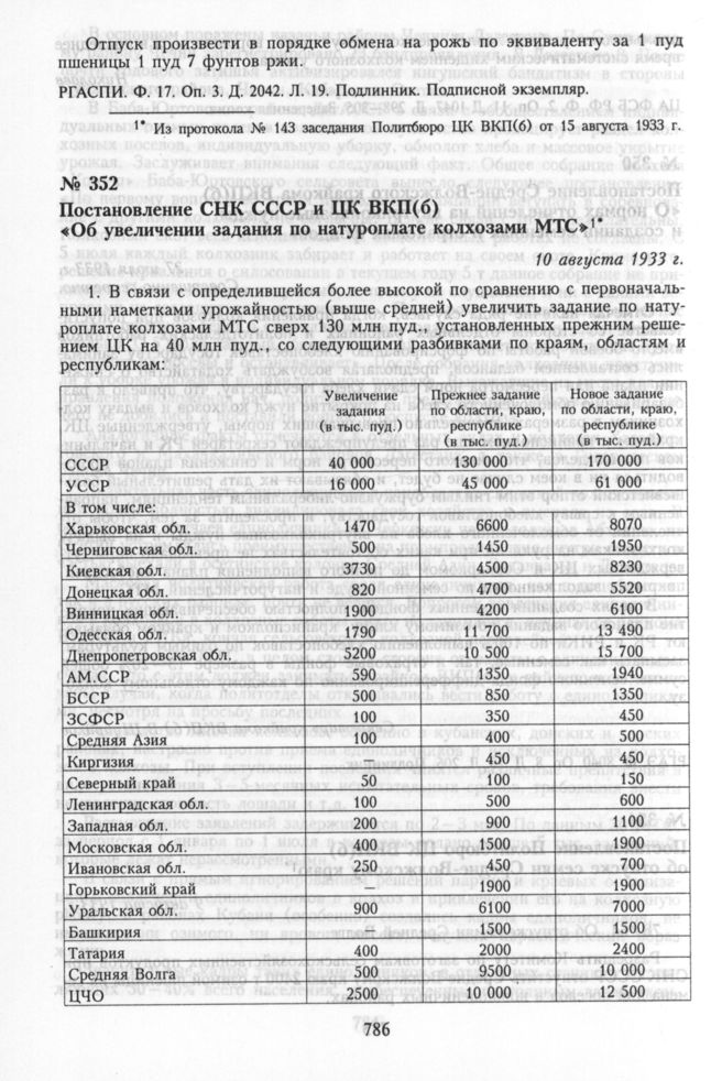 Постановление СНК СССР и ЦК ВКП(б) «Об увеличении задания по натуроплате колхозами МТС». 10 августа 1933 г.