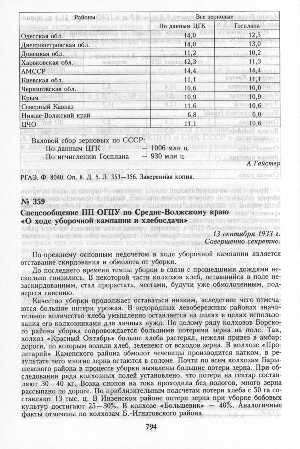 Спецсообщение ПП ОГПУ по Средне-Волжскому краю «О ходе уборочной кампании и хлебосдачи». 13 сентября 1933 г. // ЦА ФСБ РФ. Ф. 2. Оп. 11. Д. 1048. Л. 93—99. Заверенная копия.