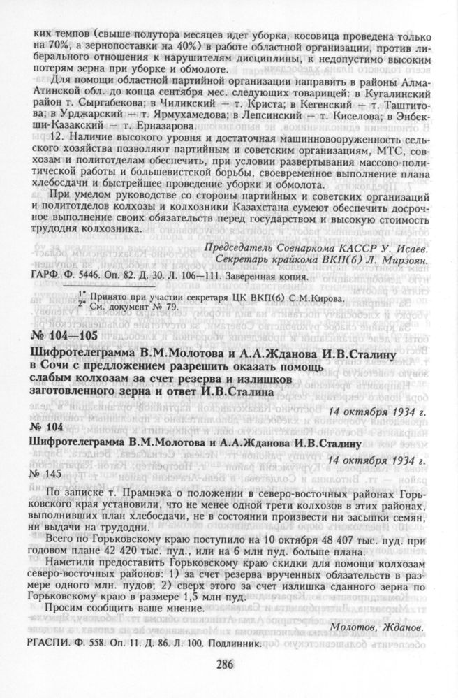 Шифротелеграмма В.М. Молотова и А.А. Жданова И.В. Сталину в Сочи с предложением разрешить оказать помощь слабым колхозам за счет резерва и излишков заготовленного зерна и ответ И.В. Сталина. Шифротелеграмма В.М. Молотова и А.А. Жданова И.В. Сталину. 14 октября 1934 г.