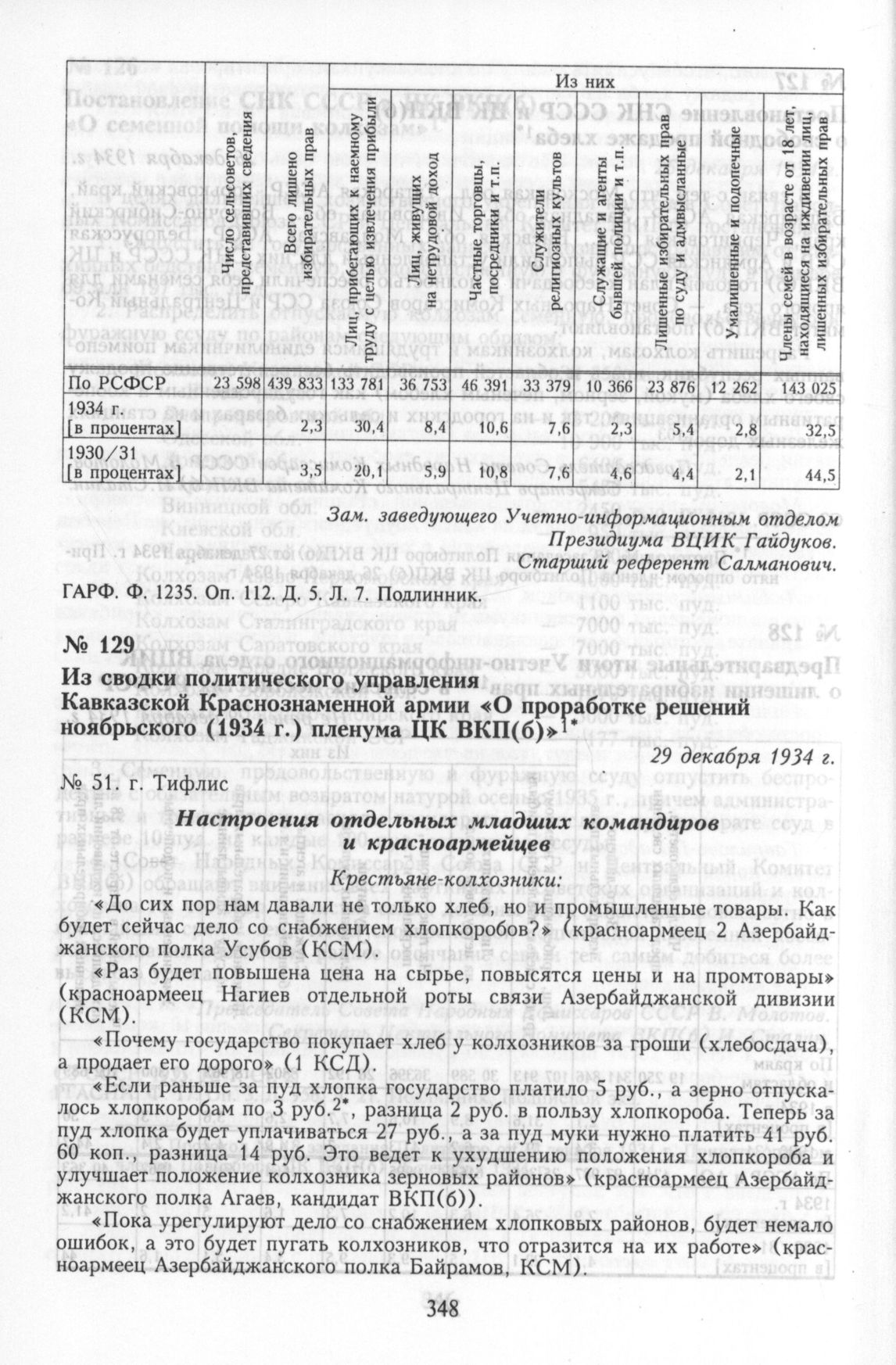 Из сводки политического управления Кавказской Краснознаменной армии «О проработке решений ноябрьского (1934 г.) пленума ЦК ВКП(б)». 29 декабря 1934 г.