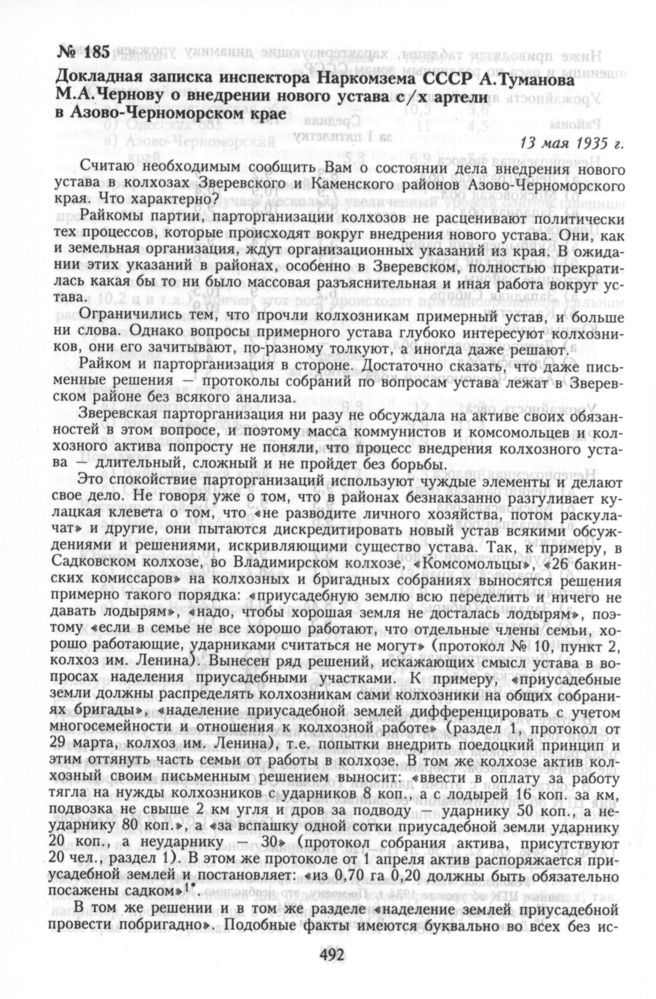 Докладная записка инспектора Наркомзема СССР А. Туманова М.А. Чернову о внедрении нового устава с /х артели в Азово-Черноморском крае. 13 мая 1935 г.