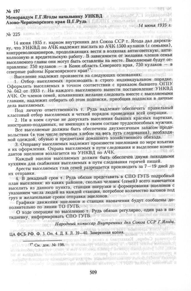 Материалы о выселении кулачества и контрреволюционных элементов из Азово-Черноморского края. Меморандум Г.Г. Ягоды начальнику УНКВД Азово-Черноморского края П.Г. Рудь. 14 июня 1935 г. // ЦА ФСБ РФ. Ф. 3. Оп. 4. Д. 8. Л. 39-40. Заверенная копия.