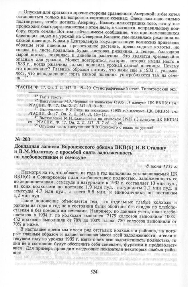 Докладная записка Воронежского обкома ВКП(б) И.В. Сталину и В.М. Молотову с просьбой снять задолженность по хлебопоставкам и семссуде. 8 июня 1935 г.