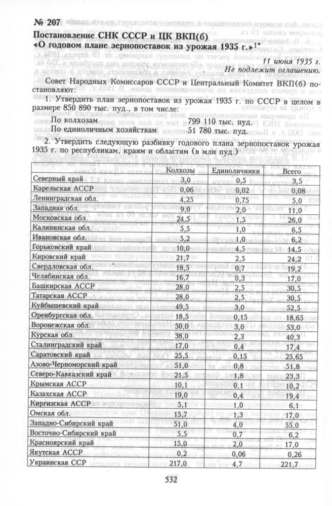Постановление СНК СССР и ЦК ВКП(б) «О годовом плане зернопоставок из урожая 1935 г.». 11 июня 1935 г. // ГАРФ Ф 5446. Oп. 1. Д. 481. Л. 132—133. Копия; РГАСПИ. Ф. 17. Оп. 3. Д. 965. Л. 55—56. Заверенная копия.