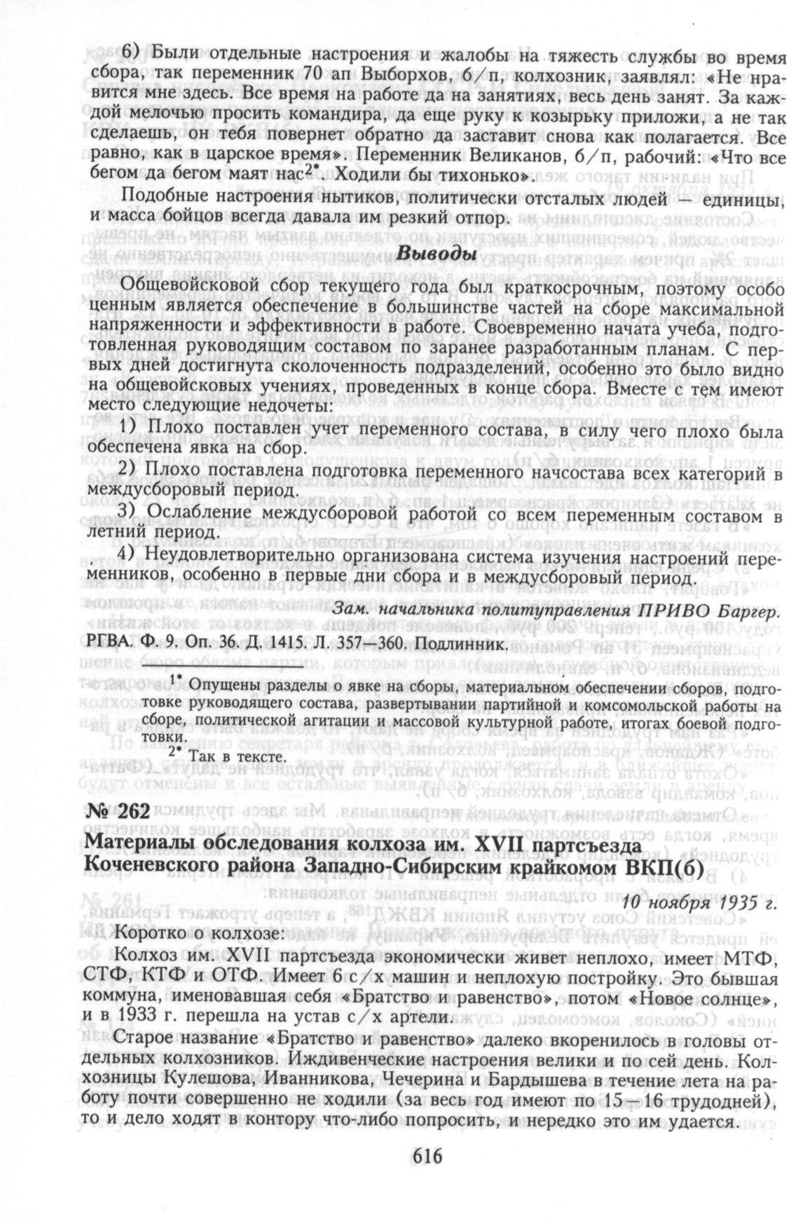 Материалы обследования колхоза им. XVII партсъезда Коченевского района Западно-Сибирским крайкомом ВКП(б). 10 ноября 1935 г. // ГАНО. Ф. П-3. Оп. 9. Д. 873, Л. 214-222. Подлинник.