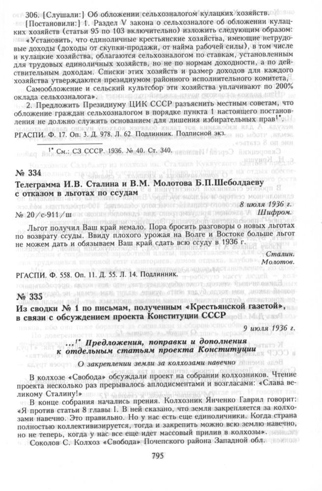 Телеграмма И.В. Сталина и В.М. Молотова Б.П. Шеболдаеву с отказом в льготах по ссудам. 8 июля 1936 г.