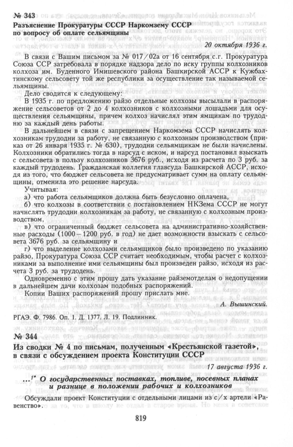 Запрос заведующего Имишевского райзо Башкирской АССР С. Нагимова в Наркомзем СССР с просьбой разъяснить условия оплаты трудодней за работы, не связанные с колхозным производством, и разъяснение Прокуратуры СССР. Разъяснение Прокуратуры СССР Наркомзему СССР по вопросу об оплате сельямщины. 20 октября 1936 г. // РГАЭ. Ф. 7986. Oп. 1. Д. 1377. Л. 19. Подлинник.