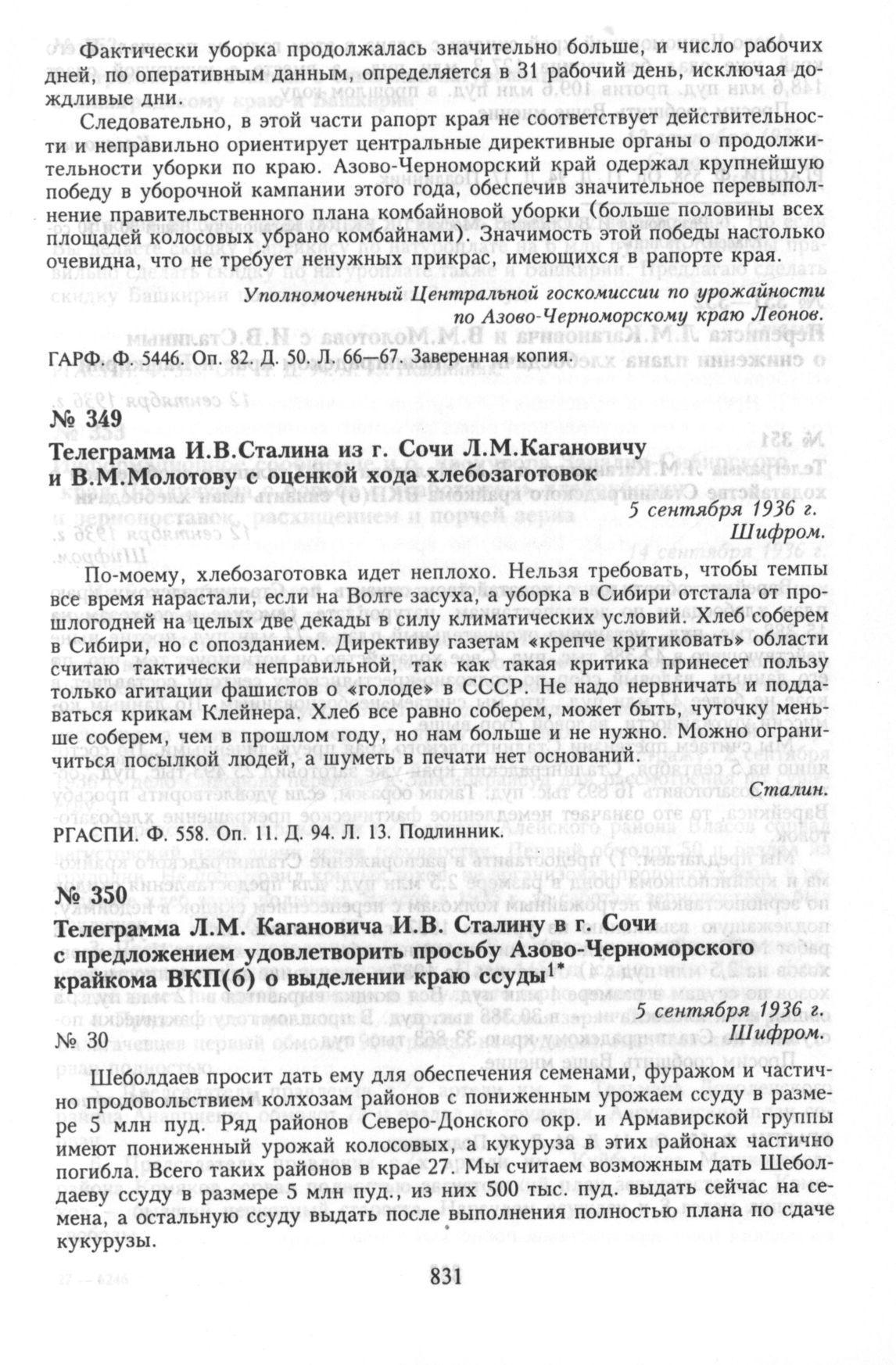Телеграмма Л.М. Кагановича И.В. Сталину в г. Сочи с предложением удовлетворить просьбу Азово-Черноморского крайкома ВКП(б) о выделении краю ссуды. 5 сентября 1936 г.