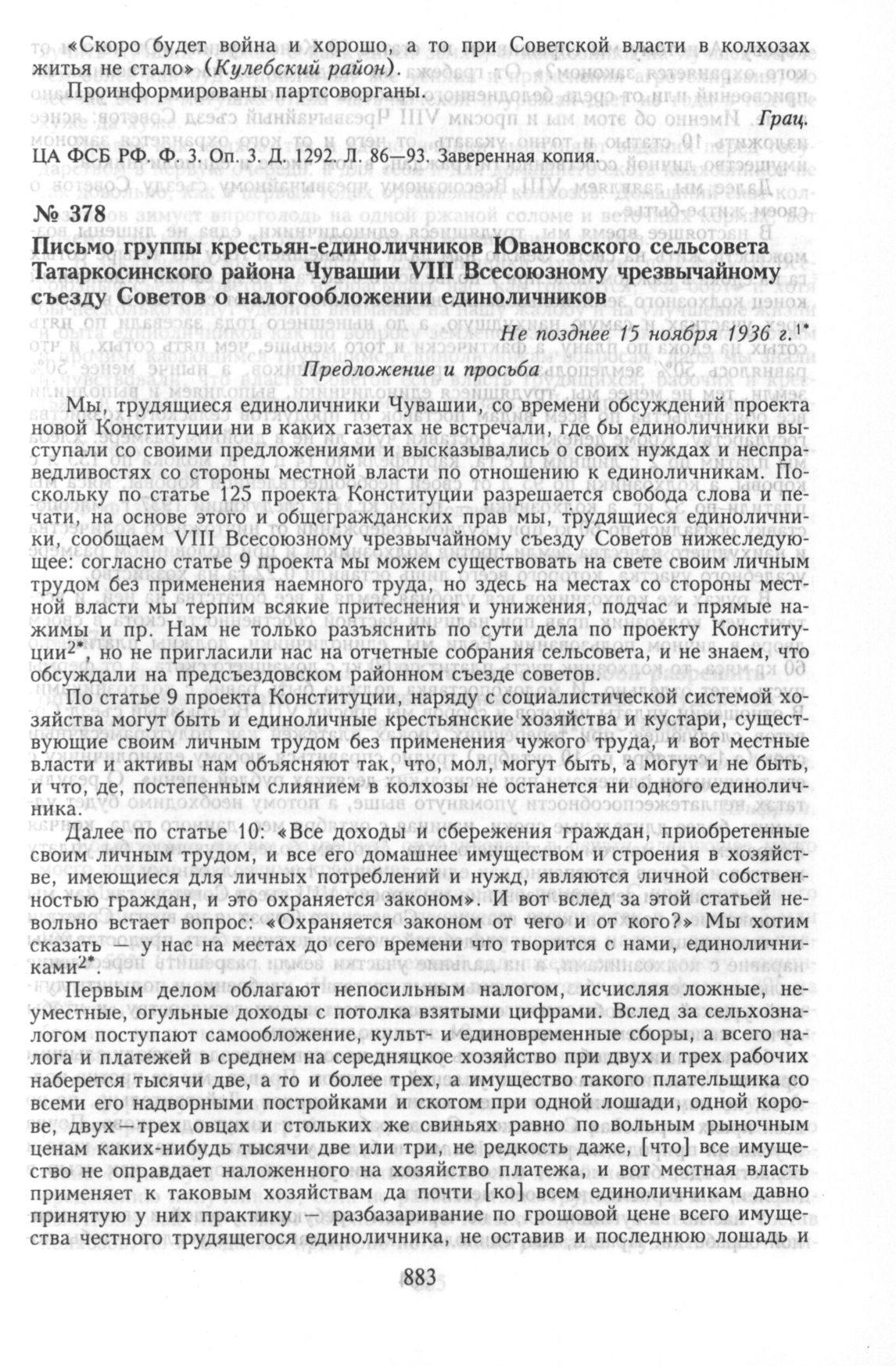 Письмо группы крестьян-единоличников Ювановского сельсовета Татаркосинского района Чувашии VIII Всесоюзному чрезвычайному съезду Советов о налогообложении единоличников. Не позднее 15 ноября 1936 г.