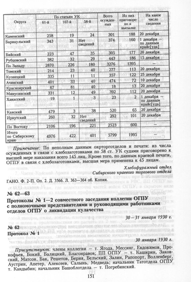 Протоколы № 1—2 совместного заседания коллегии ОГПУ с полномочными представителями и руководящими работниками отделов ОГПУ о ликвидации кулачества. Протокол № 1. 30 января 1930 г. // ЦА ФСБ РФ. Ф. 2 ос. Оп. 8. Д. 35. Л. 2—3. Заверенная копия.