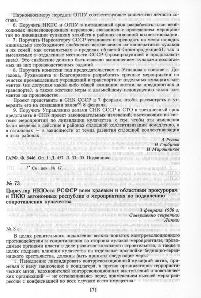 Циркуляр НКЮста РСФСР всем краевым и областным прокурорам и НКЮ автономных республик о мероприятиях по подавлению сопротивления кулачества. 3 февраля 1930 г. // ГАРФ. Ф. 353. Оп. 16. Д. 9. Л. 12—13 об. Подлинник.