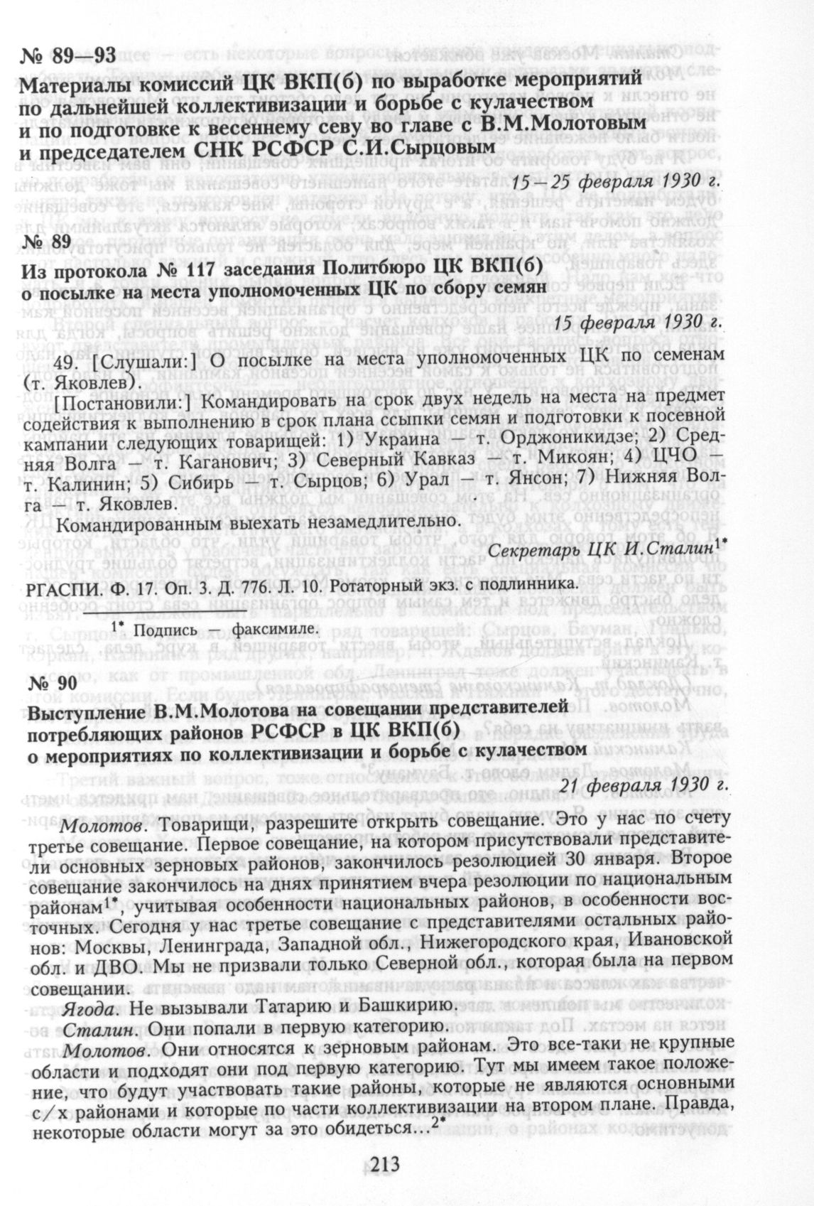 Выступление В.М. Молотова на совещании представителей потребляющих районов РСФСР в ЦК ВКП(б) о мероприятиях по коллективизации и борьбе с кулачеством. 21 февраля 1930 г. // РГАСПИ. Ф. 82. Оп. 2. Д. 103. Л. 54—67. Копия. Неправленая стенограмма.