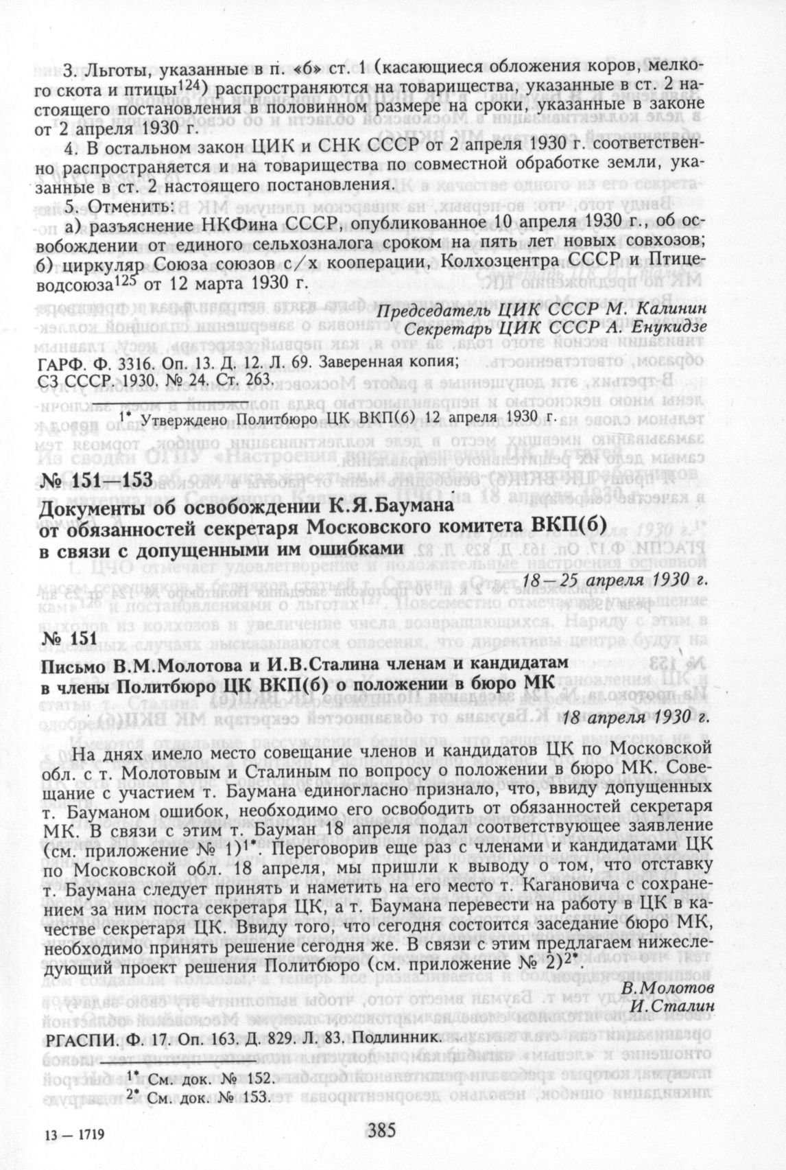 Документы об освобождении К.Я. Баумана от обязанностей секретаря Московского комитета ВКП(б) в связи с допущенными им ошибками. Письмо В.М. Молотова и И.В. Сталина членам и кандидатам в члены Политбюро ЦК ВКП(б) о положении в бюро МК. 18 апреля 1930 г.