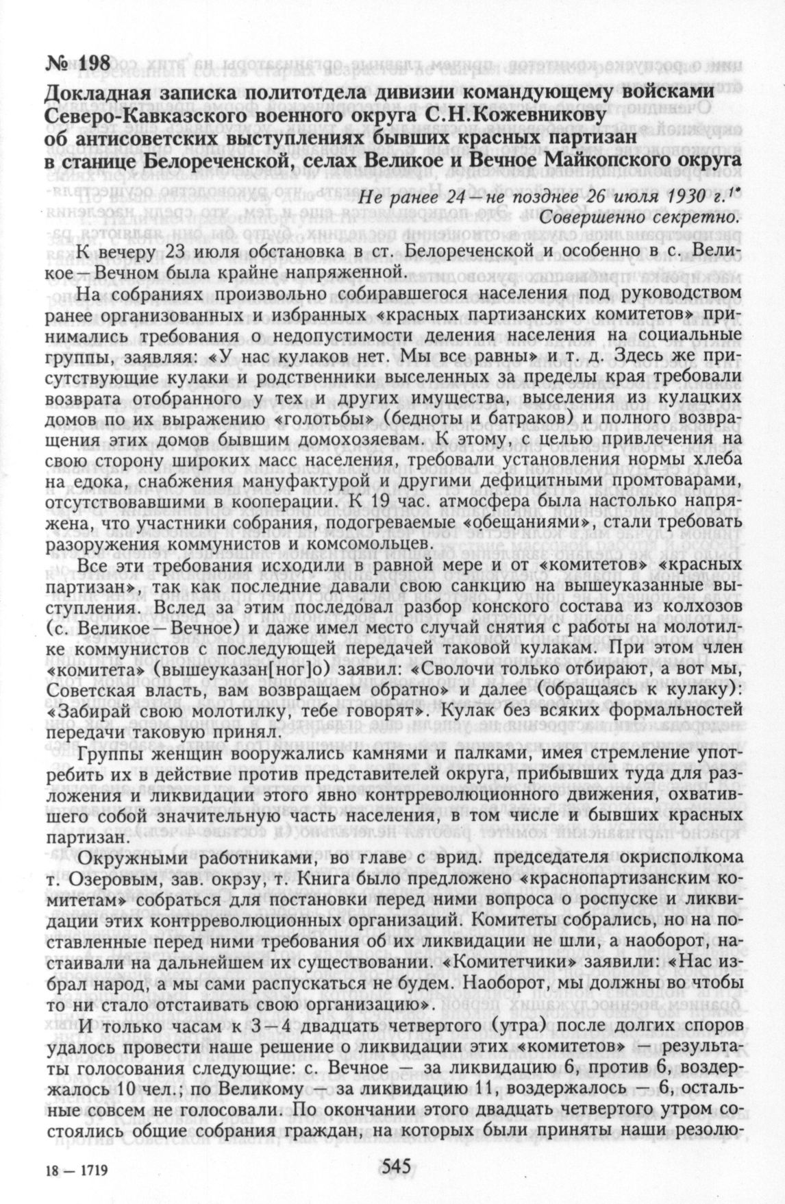 Докладная записка политотдела дивизии командующему войсками Северо-Кавказского военного округа С.Н. Кожевникову об антисоветских выступлениях бывших красных партизан в станице Белореченской, селах Великое и Вечное Майкопского округа. Не ранее 24 - не позднее 26 июля 1930 г.