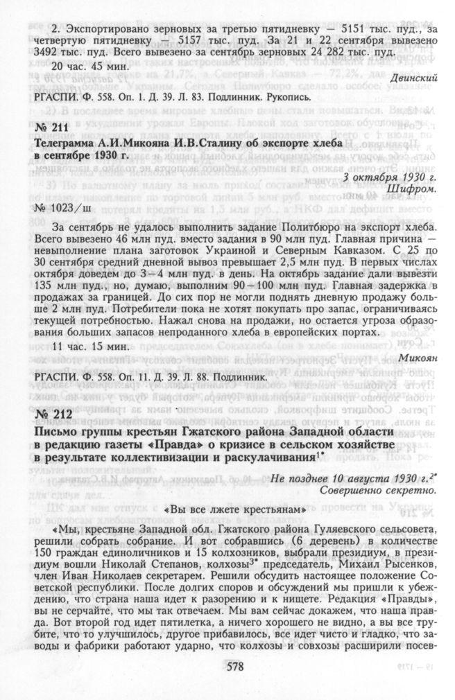 Письмо группы крестьян Гжатского района Западной области в редакцию газеты «Правда» о кризисе в сельском хозяйстве в результате коллективизации и раскулачивания. 10 августа 1930 г.
