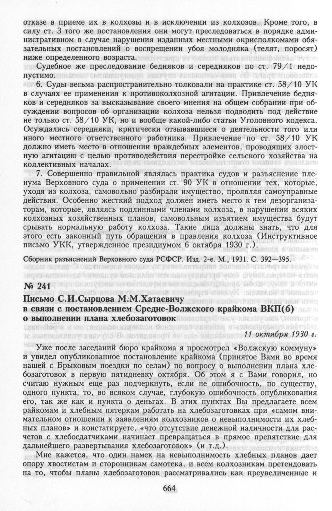 Письмо С.И. Сырцова М.М. Хатаевичу в связи с постановлением Средне-Волжского крайкома ВКП(б) о выполнении плана хлебозаготовок. 11 октября 1930 г. // РГАСПИ. Ф. 558. Оп. 11. Д. 805. Л. 157-157 об. Копия.